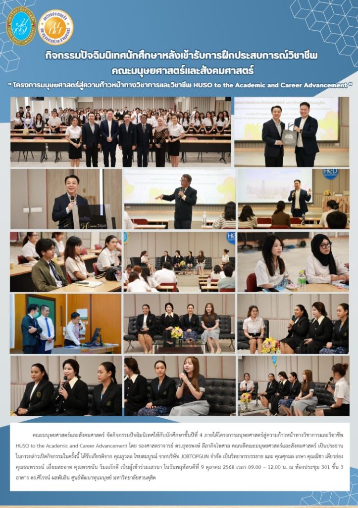 คณะมนุษยศาสตร์และสังคมศาสตร์ จัดกิจกรรมปัจฉิมนิเทศให้กับนักศึกษาชั้นปีที่ 4 ภายใต้โครงการมนุษยศาสตร์สู่ความก้าวหน้าทางวิชาการและวิชาชีพ HUSO to the Academic and Career Advancement โดย รองศาสตราจารย์ ดร.ยุทธพงษ์ ลีลากิจไพศาล คณบดีคณะมนุษยศาสตร์และสังคมศาสตร์ เป็นประธานในการกล่าวเปิดกิจกรรมในครั้งนี้ ได้รับเกียรติจาก คุณภูวดล ไชยสมบูรณ์ จากบริษัท JOBTOPGUN จำกัด เป็นวิทยากรบรรยาย และ คุณศุกมล เกษา คุณณิชา เตียวย่อง คุณธนพรรธน์ เอี่ยมสะอาด คุณพรชนัน วิมลภักดี เป็นผู้เข้าร่วมเสวนา ในวันพฤหัสบดีที่ 9 ตุลาคม 2568 เวลา 09.00 – 12.00 น. ณ ห้องประชุม 301 ชั้น 3 อาคาร ดร.ศิโรจน์ ผลพันธิน ศูนย์พัฒนาทุนมนุษย์ มหาวิทยาลัยสวนดุสิต