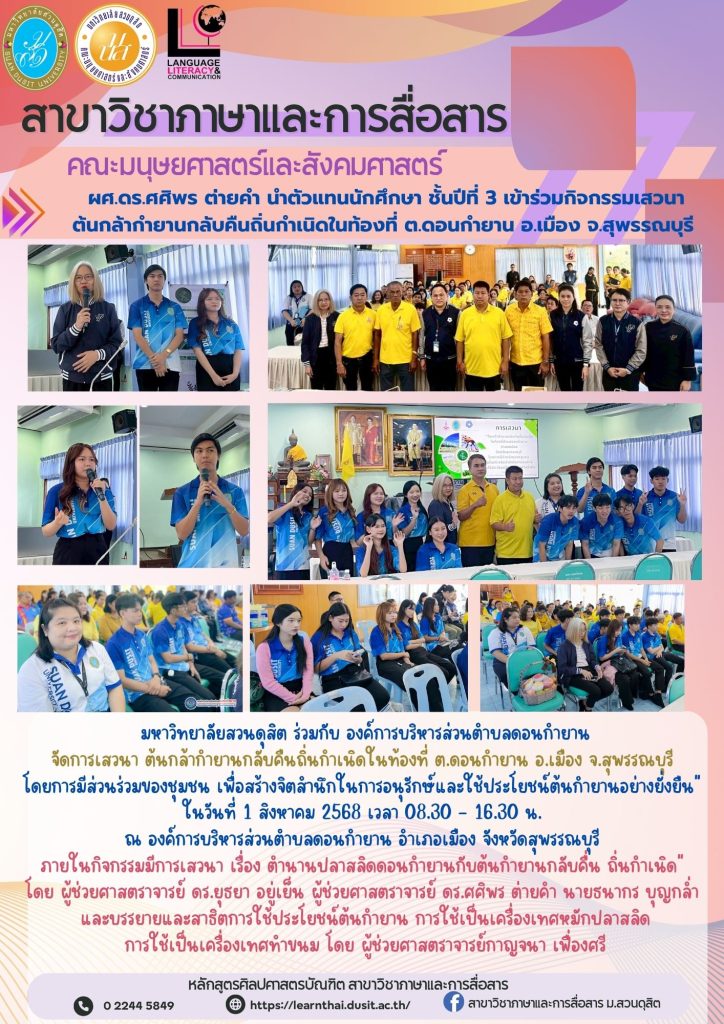 ผศ.ดร.ศศิพร ต่ายคํา นำตัวแทนนักศึกษา ชั้นปีที่ 3 เข้าร่วมกิจกรรมเสวนาต้นกล้ากํายานกลับคืนถิ่นกําเนิดในท้องที่ ต.ดอนกํายาน อ.เมือง จ.สุพรรณบุรี ซึ่งมหาวิทยาลัยสวนดุสิต ร่วมกับ องค์การบริหารส่วนตำบลดอนกำยาน จัดเสวนา ต้นกล้ากํายานกลับคืนถิ่นกําเนิดในท้องที่ ต.ดอนกํายาน อ.เมือง จ.สุพรรณบุรี โดยการมีส่วนร่วมของชุมชน เพื่อสร้างจิตสํานึกในการอนุรักษ์และใช้ประโยชน์ต้นกํายานอย่างยั่งยืน” ในวันที่ 1 สิงหาคม 2568 เวลา 08.30 – 16.30 น. ณ องค์การบริหารส่วนตําบลดอนกํายาน อําเภอเมือง จังหวัดสุพรรณบุรี ภายในกิจกรรมมีการเสวนา เรื่อง ตํานานปลาสลิดดอนกํายานกับต้นกํายานกลับคื่น ถิ่นกําเนิด” โดย ผู้ช่วยศาสตราจารย์ ดร.ยุธยา อยู่เย็น ผู้ช่วยศาสตราจารย์ ดร.ศศิพร ต่ายคํา นายธนากร บุญกล่ำ และบรรยายและสาธิตการใช้ประโยชน์ต้นกํายาน การใช้เป็นเครื่องเทศหมักปลาสลิด การใช้เป็นเครื่องเทศทำขนม โดย ผู้ช่วยศาสตราจารย์กาญจนา เฟื่องศรี
