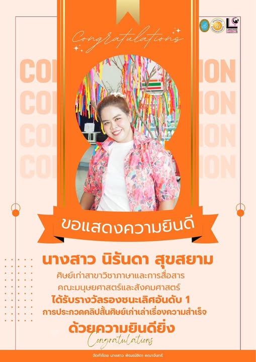 ขอแสดงความยินดีกับ พี่กิว นางสาวนิรันดา สุขสยาม ศิษย์เก่าหลักสูตรศิลปศาสตรบัณฑิต สาขาวิชาภาษาและการสื่อสาร คณะมนุษยศาสตร์และสังคมศาสตร์ ได้รับรางวัลรองชนะเลิศอันดับ 1 ในการประกวดคลิปสั้นศิษย์เก่าเล่าเรื่องความสำเร็จ