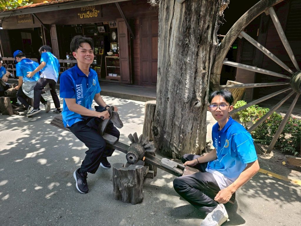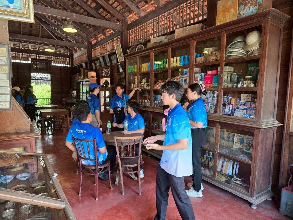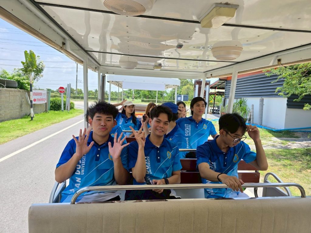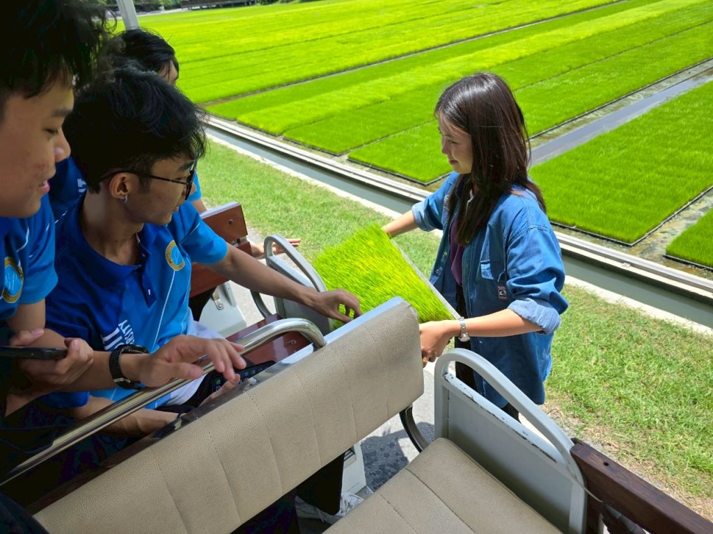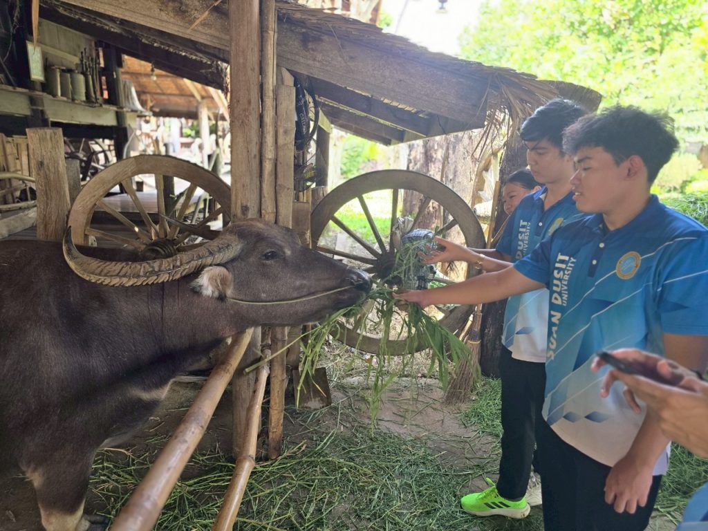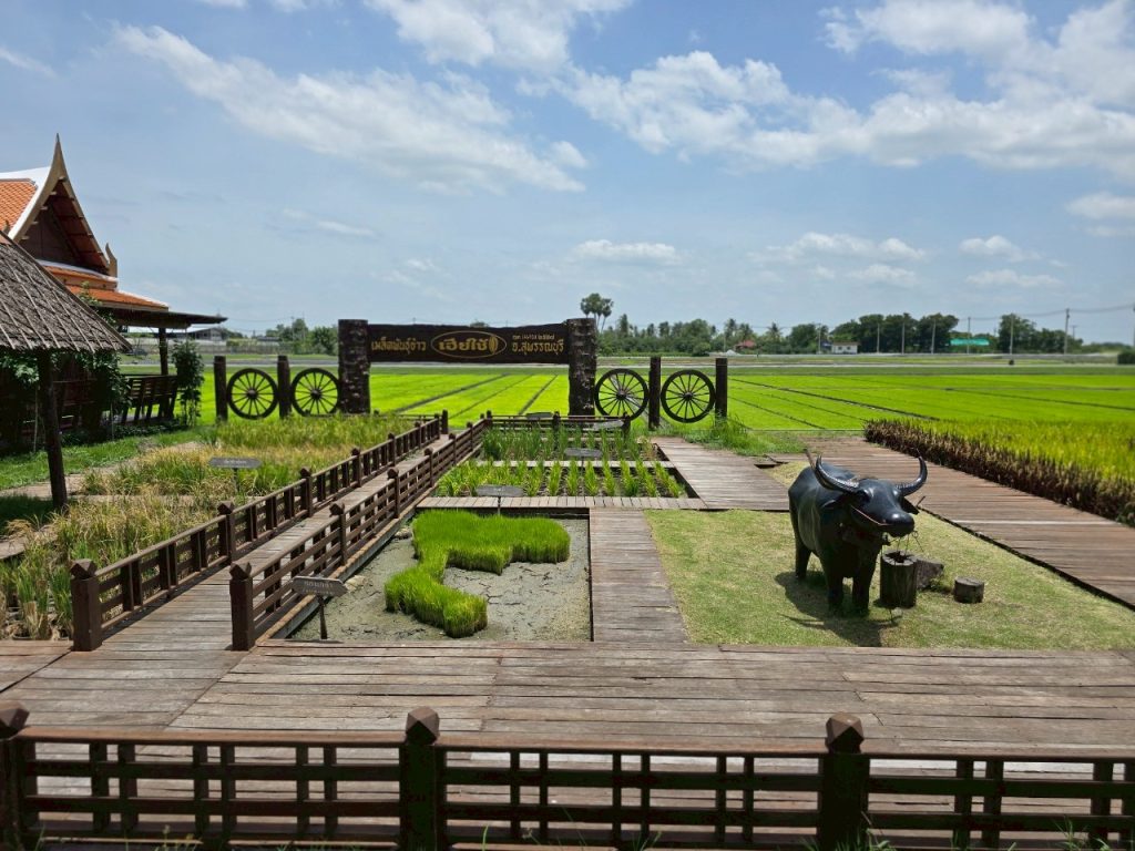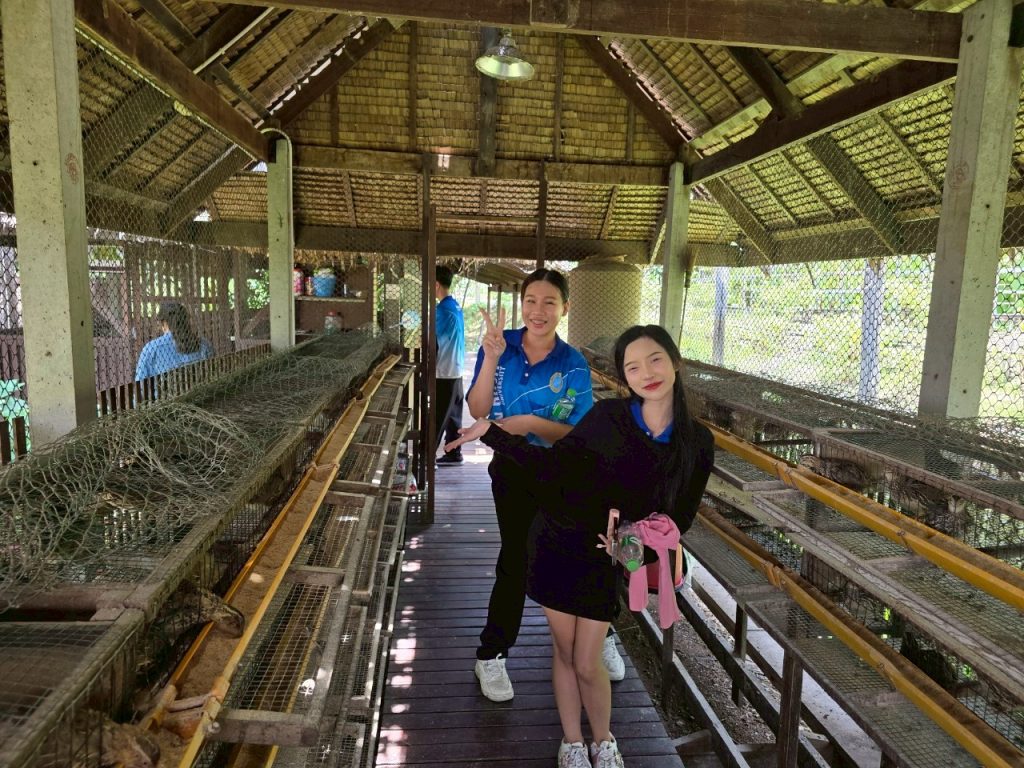 ผู้ช่วยศาสตราจารย์ ดร.ศศิพร ต่ายคำ กรรมการบริหารหลักสูตรศิลปศาสตรบัณฑิต สาขาวิชาภาษาและการสื่อสาร นำนักศึกษา ชั้นปีที่ 3 เข้าเยี่ยมชมศูนย์เรียนรู้วิถีชีวิตและจิตวิญญาณชาวนาไทย พร้อมกิจกรรมนั่งรถชมแปลงเกษตร แปลงอนุบาลกล้าแผ่น เรียนรู้วิถีชีวิตความเป็นอยู่ของคนไทยในอดีต ณ เรือนวิถีชีวิตชาวนาไทย กิจกรรมป้อนหญ้าครอบครัวควายไทย ชมแปลงนาสาธิต แปลงศิลปะนาข้าว วันที่ 1 สิงหาคม 2568 ณ ศูนย์เรียนรู้วิถีชีวิตและจิตวิญญาณชาวนาไทย – นาเฮียใช้ จังหวัดสุพรรณบุรี