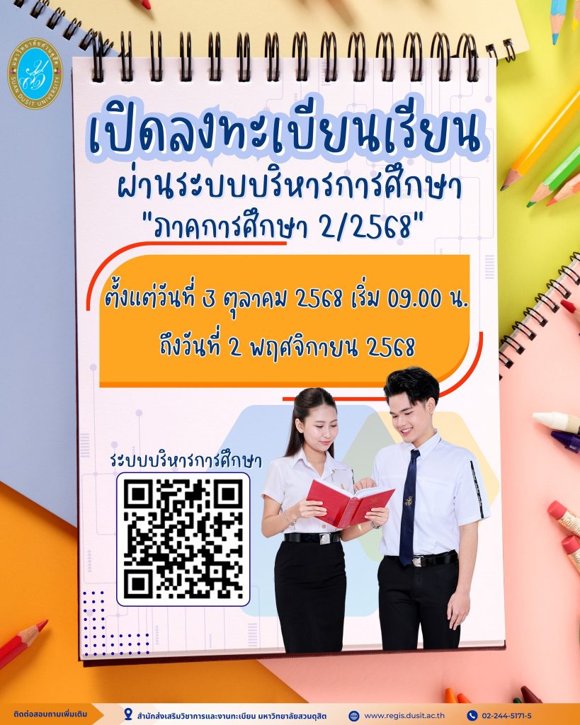 เปิดระบบลงทะเบียนเรียน ผ่านระบบบริหารการศึกษา ภาคการศึกษา 2/2568 ตั้งแต่ 3 ตุลาคม 2568 ถึง 2 พฤศจิกายน 2568